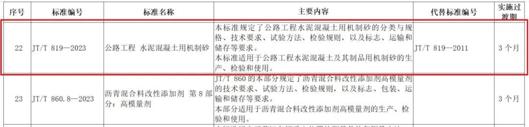近日,交通運輸部發(fā)布29項交通運輸行業(yè)標準的公告,其中有標準編號為JT/T 819—2023的《公路工程水泥混凝土用機制砂》。這標志著,在我國公路工程領域,水泥混凝土用機制砂正式有了新的行業(yè)標準,這將大大促進機制砂在該領域的推廣應用。